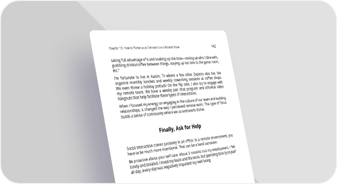 Chapter12: HowtoThriveasanExtrovertonaRemoteTeam 142 takingfull advantageofitandsoakingupthetime—mixingupwhoIdinewith, grabbing drinks/coffee between things, staying up too late in the game room, etc.” I’m fortunate to live in Austin, TX where a few other Zapiens also live. We organize monthly lunches and weekly coworking sessions at coffee shops. We even threw a holiday potluck! On the flip side, I also try to engage with my remote team. We have a weekly pair chat program and informal video hangoutsthathelpfacilitate these types of interactions. WhenIfocusedmyenergyonengaginginthecultureofourteamandbuilding relationships, it changed the way I perceived remote work. This type of focus builds a sense of community where we as extroverts thrive. Finally, Ask for Help Social interaction comes passively in an office. In a remote environment, you havetobemuchmoreintentional.Thatcanbeahardtransition. Beproactive about your self-care. About 3 months into my employment, I felt lonelyandisolated.Ilovedmyteamandthework,butspendingtimebymyself all day, every day was negatively impacted my well being.