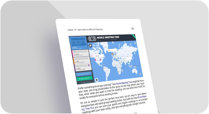 Chapter10: HowtoWorkinDifferentTimezones 120 Prefersomethingmoreeye-catching?ThenWorldMeetingTimemightbemore your style. Just drag placeholders to the spots on the map where your team lives, enter when you want to hold the meeting, and see what time that’ll be locally for everyone before sending invites. It’s not as simple to pick the perfect time here, but it’s easy to spot where everyonelivesandsendgroupmeetinginvites.AndwiththenewWorldMeet- ing Time Pro, you can save your guests and regular meetings to re-schedule meetingswithyourteameasily,andsynceverythingwithGoogleCalendar. Build Your OwnSmallWorld Remote working isn’t automatically a freer way to work—it can be just as stressful as any 9-to-5 job. Teach your remote team to be flexible about time, though, and everyone’s lives will be easier. Plus, you’ll be able to hire the best peoplefromanywherearoundtheglobe. That might mean you can move to a city where it’s easier to start a family, or extend your “vacation” to a few months on the beach each year. You might even find time to visit some of the incredible cities on Nomad List while still contributing your all to your team.