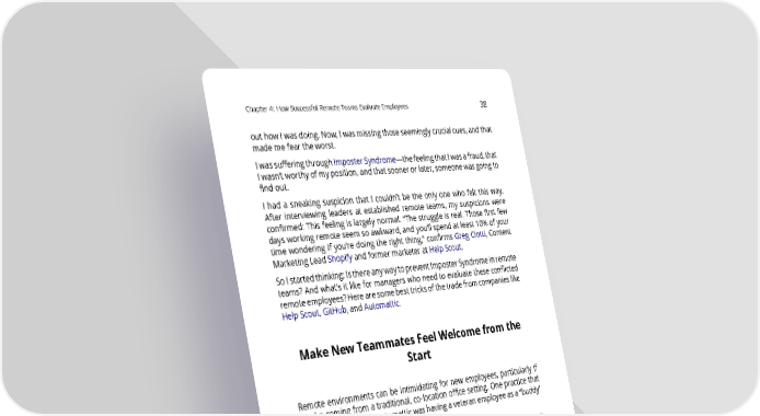 Chapter4: HowSuccessfulRemoteTeamsEvaluateEmployees 38 outhowIwasdoing.Now,Iwasmissingthoseseeminglycrucialcues,andthat mademefeartheworst. I wassufferingthroughImposterSyndrome—thefeelingthatIwasafraud,that I wasn’t worthy of myposition,andthatsoonerorlater,someonewasgoingto find out. I had a sneaking suspicion that I couldn’t be the only one who felt this way. After interviewing leaders at established remote teams, my suspicions were confirmed: This feeling is largely normal. “The struggle is real. Those first few days working remote seem so awkward, and you’ll spend at least 10% of your time wondering if you’re doing the right thing,” confirms Greg Ciotti, Content MarketingLeadShopifyandformermarketeratHelpScout. SoIstartedthinking:IsthereanywaytopreventImposterSyndromeinremote teams? And what’s it like for managers who need to evaluate these conflicted remoteemployees?Herearesomebesttricksofthetradefromcompanieslike HelpScout,GitHub,andAutomattic. MakeNewTeammatesFeelWelcomefromthe Start Remote environments can be intimidating for new employees, particularly if they’re coming from a traditional, co-location office setting. One practice that helpedmeearlyonatAutomatticwashavingaveteranemployeeasa“buddy” to help me navigate the uncharted waters. I’m not alone in my desire for camaraderie in remote workplace. Ciotti recom- mendsthebuddyapproachtohelpnewemployeesfeelwelcome.There’seven scienceindicatingthatemployeeswhohavefriendsatwork“getsicklessoften, suffer fewer accidents, and change jobs less frequently.” Ciottioffersfivetangibletakeawaysforbuddiespairedupwithnewemployees: 1. Shootthenewemployeeaquickemailbeforetheystarttowelcomethem to the team. Don’t use email? Slack or any other communication tool will work.