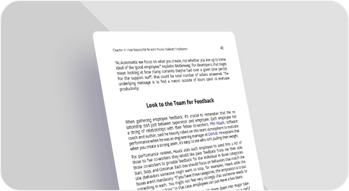 Chapter4: HowSuccessfulRemoteTeamsEvaluateEmployees 40 “At Automattic we focus on what you create, not whether you live up to some ideal of the ‘good employee,’” explains Mullenweg. For developers, that might mean looking at how many commits they’ve had over a given time period. For the support staff, that could be total number of tickets answered. The underlying message is to find a metric outside of hours spent to evaluate productivity. LooktotheTeamforFeedback When gathering employee feedback, it’s crucial to remember that the re- lationship isn’t just between supervisor and employee. Each employee has a string of relationships with their fellow co-workers. Phil Haack, software coach and author, said he heavily relied on this team atmosphere to evaluate performancewhenhewasanengineeringmanageratGitHub.Heexplainsthat whenyoucreateastrongteam,it’seasytoseewhoisn’tpullingtheirweight. For performance reviews, Haack asks each employee to send him a list of three to five co-workers they would like peer feedback from. He then asks those co-workers to provide feedback for the individual in three categories: Start, Stop, and Continue. Each box should focus on behaviors that match the title (behaviors someone might want to stop, for example). Haack adds the boxesaren’tmandatory.“Ifyouhavethreecategories,thetemptationistoput something in each. You might not feel very strongly that someone needs to stop doing something.” In that case, employees can just leave a box blank. Haack takes those bits of feedback and distills them down into major take- aways, combining duplicates and making sure feedback is worded in a useful manner. The end result is a collection of behavior-based feedback from indi- viduals you work with daily. Twoelementsarecrucial.First,theformat(Start,Stop,andContinue)provides aframeworkthatmakesadifficulttask(givingpeerfeedback)easier.Themain purpose is to help employees organize their thoughts. Second, the feedback shouldbefocusedonbehaviors,notpersonalities.Theformerissomethingan employeecanimprove;thelatterisn’t.