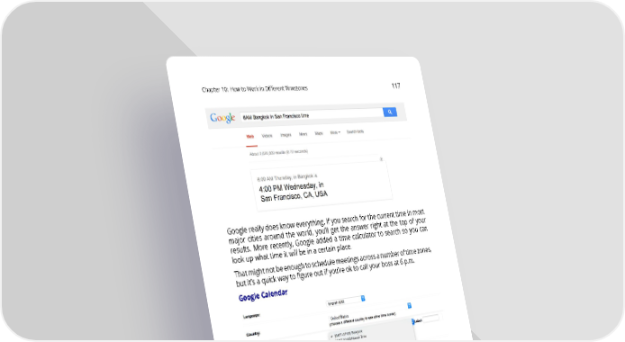 Chapter10: HowtoWorkinDifferentTimezones 117 Googlereallydoesknoweverything.Ifyousearchforthecurrenttimeinmost major cities around the world, you’ll get the answer right at the top of your results. More recently, Google added a time calculator to search so you can look up what time it will be in a certain place. Thatmightnotbeenoughtoschedulemeetingsacrossanumberoftimezones, butit’s a quick way to figure out if you’re ok to call your boss at 6 p.m. GoogleCalendar Google Calendar looks basic at first glance, but it’s packed with features that makeitgreatforremoteteams—orreallyanyteam.Youcansetyourowntime zone,andsavethetimezonesyouworkwithmosttohaveaneasywaytoswitch betweenthem. Then, if you want another easy way to know what time it is everywhere your team’s located, you can turn on the World clock in the Calendar Labs settings.