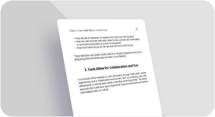 Chapter3: HowtoBuildCultureinaRemoteTeam 27 • Howwetalktocustomers(isspeedmoreimportantthanquality?) • How we communicate with each other (is this a phone call conversation or an email conversation or a chat conversation?) • Howmuchworkdoyoudo(dowework40hoursor80hours?) Those decisions and values create culture in remote companies more than a ping pong table would because our work is our lifeblood. 3. Tools Allow for Collaboration and Fun A co-located office develops its own personality through inside jokes, shared experiences, and a collaborative environment, such as a meeting room with whiteboards. A remote team needs to develop something similar. The easiest waytodothisiswithyourday-to-daytoolset.Herearesometoolswelovethat havehelpedbuildourculture.