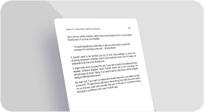 Chapter10: HowtoWorkinDifferentTimezones 107 out to be our winter solution. Both times have worked out for us, but they’ve forced each of us to be a bit flexible. “I’d quite happily stay a little later or get up a little earlier to avoid the stresses of a morning commute” - Lindsay Brand It doesn’t need to be terrible: just try to limit long meetings so you’re not straining someone’s schedule. And if you’re joining a team from far away, be preparedtobethemostflexibleone. It might even work out great for you, if you like to work nontraditional hours anyway. Software engineer Kevin Furbish found this to be true about his remote team at Intuit. “Many of us tend to work crazy hours, which mitigates being in different time zones.” Butevenstill, if you want to make a distributed team work, you need to accept atimeshift.“I’ll take phonecallslateintheeveningfromfolksthatdon’trealize I’m on the east coast and consider that part of the job for someone working remotelyinadifferenttimezone,”Furbishsays.