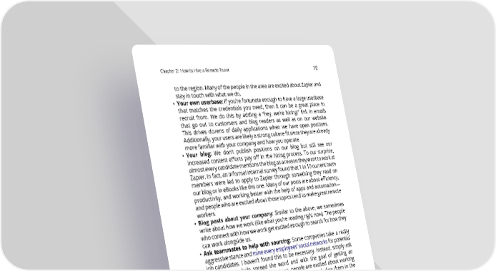 Chapter2: HowtoHireaRemoteTeam 19 totheregion.ManyofthepeopleintheareaareexcitedaboutZapierand stay in touch with what we do. • Yourownuserbase:Ifyou’refortunateenoughtohavealargeuserbase that matches the credentials you need, then it can be a great place to recruit from. We do this by adding a “hey, we’re hiring!” link in emails that go out to customers and blog readers as well as on our website. This drives dozens of daily applications when we have open positions. Additionally,yourusersarelikelyastrongculturefitsincetheyarealready morefamiliarwithyourcompanyandhowyouoperate. • Your blog: We don’t publish positions on our blog but still see our increased content efforts pay off in the hiring process. To our surprise, almosteverycandidatementionstheblogasareasontheywanttoworkat Zapier.Infact,aninformalinternalsurveyfoundthat1in10currentteam members were led to apply to Zapier through something they read on ourblogorineBookslikethisone.Manyofourpostsareaboutefficiency, productivity, and working better with the help of apps and automation— andpeoplewhoareexcitedaboutthosetopicstendtomakegreatremote workers. • Blog posts about your company: Similar to the above, we sometimes write abouthowwework(likewhatyou’rereadingrightnow).Thepeople whoconnectwithhowweworkgetexcitedenoughtosearchforhowthey canworkalongsideus. • Ask teammates to help with sourcing: Some companies take a really aggressivestanceandmineeveryemployees’socialnetworksforpotential job candidates. I haven’t found this to be necessary. Instead, simply ask teammates to help spread the word and with the goal of getting an awesomenewteammate.Oftentimes,peopleareexcited about working with and helping pick out their new teammate, so including them in the process is a net benefit to all. • Job boards: As a last resort, job boards can be a source of candidates. Oftenthesehavebottomofthebarrelcandidateswhoareconstantlyjob hunting and mostly looking for any job—particularly if it lets them work fromhome,notyourjobinparticular.Butyoucanoccasionallystrikegold here. • Share, share, share: Use Twitter, LinkedIn, Facebook, AngelList, and any channelyouhaveaccesstotoletpeopleknowthatyou’rehiring.Themore spread you can get, the more likely your job post will stumble across the right person’s desk.