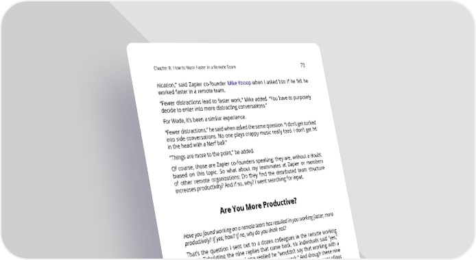 Chapter8: HowtoWorkFasterinaRemoteTeam 73 nication,” said Zapier co-founder Mike Knoop when I asked him if he felt he workedfasterinaremoteteam. “Fewer distractions lead to faster work,” Mike added. “You have to purposely decide to enter into more distracting conversations.” For Wade,it’s been a similar experience. “Fewerdistractions,”hesaidwhenaskedthesamequestion.“Idon’tgetsucked into side conversations. No one plays crappy music really loud. I don’t get hit in the head with a Nerf ball.” “Things are more to the point,” he added. Of course, those are Zapier co-founders speaking; they are, without a doubt, biased on this topic. So what about my teammates at Zapier or members of other remote organizations: Do they find the distributed team structure increases productivity? And if so, why? I went searching for input. AreYouMoreProductive? Haveyoufoundworkingonaremoteteamhasresultedinyouworkingfaster,more productively? If yes, how? If no, why do you think not? That’s the question I sent out to a dozen colleagues in the remote working world. Tabulating the nine replies that came back, six individuals said “yes,” two said “yes and no,” and one replied he “wouldn’t say that working with a remoteteamhasreallyaffectedthepaceofmywork.”Andthoughthesenine answersvary,thereisaconstanttheme:aremoteworkingenvironmentallows for a faster pace of work. Whether or not that’s the intention of the remote employer,it’s the common outcome. Belle Cooper—co-founder of Hello Code based in Melbourne—summed it up best in her response. “Working remotely has definitely led me to find ways to work faster,” Cooper says. “It didn’t happen naturally as a result of remote work, but the freedom of remote work means I can experiment with different work spaces, different worktimesandapproaches,andfindwhatworksbestformeaswellaswhat helps meworkfastest.”