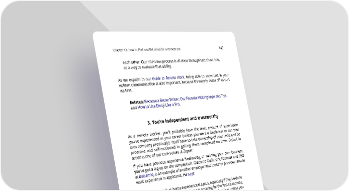Chapter13: HowtoFindandGetHiredforaRemoteJob 149 eachother.Ourinterviewprocessisalldonethroughtextchats,too, as a way to evaluate that ability. As we explain in our Guide to Remote Work, being able to show tact in your written communicationisalsoimportant,becauseit’seasytocomeoffascurt via text. Related:BecomeaBetterWriter:OurFavoriteWritingAppsandTips andHowtoUseEmojiLikeaPro. 3. You’re independent andtrustworthy As a remote worker, you’ll probably have the least amount of supervision you’ve experienced in your career (unless you were a freelancer or ran your owncompanypreviously). You’ll have to take ownership of your tasks and be proactive and self-motivated in getting them completed on time. Default to action is one of our core values at Zapier. If you have previous experience freelancing or running your own business, you’ve got a leg up on the competition. Giacomo Guilizzoni, Founder and CEO atBalsamiq,isanexampleofanotheremployerwholooksforpreviousremote workexperienceinapplicants.Hesays: Previouswork-at-homeexperienceisaplus,especiallyifthey’vedone it for a longtime.Workingathomeisamazingforthefirstsixmonths, great for the first two years, and can be tough after that unless you comeupwithyour‘system’ for separating work from your personal life. Whatifyoudon’thavepreviousexperienceworkingsoloorremotely?Try picking up projects that you can take ownership of and be self-managed on. Even better: See if you can get a few days working remotely at your current job, so you’ll have experiencewithit.InThe4-HourWorkweek,TimFerrissoffers a script and instructions for getting your boss to let you work from home. It involves: