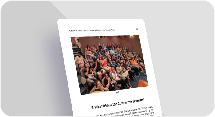 Chapter6: HowtoRunaCompanyRetreatforaRemoteTeam 58 GoT 5. WhatAbouttheCostoftheRetreats? Obviously, cost is a big consideration for doing a trip like this. Keep in mind, though, that a typical remote team saves tons of money each month by not having to pay for an office (or paying for a much smaller one than you’d normally have to have if you’re a partially remote team). We decide to invest money we save on office-related expenses into company and department retreats because of the invaluable team-building these experiences provide. At the same time, we try to keep spending on retreats reasonable; keeping everyonehappilyemployedismoreimportantthansendingeveryonetoluxury resorts overseas. Retreatsaren’tcheap,butwhat’sevenmoreexpensiveishavingaremoteteam that doesn’t work well together. Ultimately, the cost of the trip is well worth it in mymind,butyouhavetomakethatchoicebasedontheconstraintsofyour ownbusiness.
