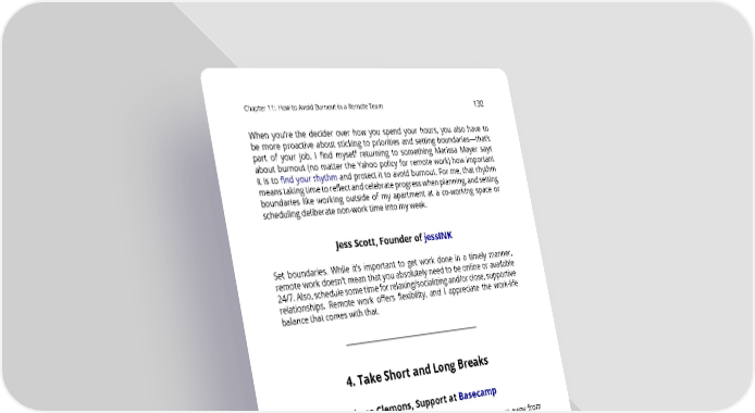 Chapter11: HowtoAvoidBurnoutinaRemoteTeam 130 When you’re the decider over how you spend your hours, you also have to be more proactive about sticking to priorities and setting boundaries—that’s part of your job. I find myself returning to something Marissa Mayer says about burnout (no matter the Yahoo policy for remote work) how important it is to find your rhythm and protect it to avoid burnout. For me, that rhythm meanstakingtimetoreflectandcelebrateprogresswhenplanning,andsetting boundaries like working outside of my apartment at a co-working space or scheduling deliberate non-work time into my week. Jess Scott, Founder of jessINK Set boundaries. While it’s important to get work done in a timely manner, remote work doesn’t mean that you absolutely need to be online or available 24/7.Also,schedulesometimeforrelaxing/socializingand/orclose,supportive relationships. Remote work offers flexibility, and I appreciate the work-life balancethatcomeswiththat. 4. Take Short and Long Breaks ChaseClemons,SupportatBasecamp Take a three-day weekend every now and then. Make sure to get away from everything for a week or two each year. With our team, we recognize that sometimes you just need to get away and recharge. So every three years, we giveeachpersonathirty-daysabbatical.Regularbreaksandvacationsgoalong waytowardspreventingburnout. TomMoor,Co-FounderofSqwiggle Split your days in two. This is pretty easy to do as a remote worker, as you can workfromdifferentlocationsinthemorningandafternoon.Havinganicewalk