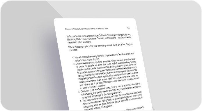 Chapter6: HowtoRunaCompanyRetreatforaRemoteTeam 53 Sofar,we’vehadcompanyretreatsinCalifornia,Washington,Florida,Colorado, Alabama,Utah,Texas,Vancouver,Toronto,andLouisiana—anddepartmental retreats in other locations. When choosing a place for your company retreat, there are a few things to consider: 1. Make it somewhere easy for folks to get to (that is, less than a two-hour drive from a major airport). 2. Go somewhere that can hold everyone. When we were a smaller team of under 30 people, we were able to do AirBnB and HomeAway houses (hotelscanfeelsterile,buthousesfeelinviting.)Aswe’vegrown,we’vehad tobroadenoursearchforplacesthatcouldaccommodatelargergroupsin onespotwhilealsostillprovidingthatsenseofprivacyandcloseness.Our PeopleOpsteamhasdoneagreatjobscoutinglocationsbasedonthese criteria and others, such as our need for a large conference room, fast and reliable Wi-Fi (at least 100mbps up and down), and breakout rooms to work on projects together. 3. Don’t worry so much about being close to tons of activities. We used to think having a large city nearby would be important but then realized we rarely took advantage of the full city amenities. 4. Thatsaid,dohavesomeactivitiesveryneartheretreatlocation.Beachside houses, resorts near hiking trails, or places with big games rooms (pool, ping pong, etc.) are great because people can entertain themselves in downtimewithoutdrivingplaces. Ultimately, though, go with what suits your company. I know some companies travel overseas or some bring everyone into headquarters.