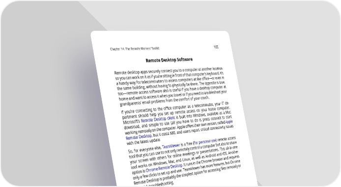 Chapter14: TheRemoteWorkers’Toolkit 165 RemoteDesktopSoftware Remotedesktopappssecurelyconnectyoutoacomputeratanotherlocation soyoucanworkonitasifyou’resittinginfrontofthatcomputer’skeyboard.It’s ahandywayfortelecommuterstoaccesscomputersattheoffice—orevenin the same building, without having to physically be there. The opposite is true, too—remoteaccesssoftwarealsoisusefulifyouhaveadesktopcomputerat homeandwanttoaccessitwhenyoutravelorifyouneedtotroubleshootyour grandparents’ email problems from the comfort of your couch. If you’re connecting to the office computer as a telecommuter, your IT de- partment should help you set up remote access on your home computer. Microsoft’s Remote Desktop client is built into Windows, available as a Mac download, and simple to use (all you have to do is press connect to start workingremotelyonthecomputer.Appleofferstheirownversion,calledApple RemoteDesktop,butit costs $80, and users report critical connectivity issues with the latest update. So, for everyone else, TeamViewer is a free (for personal use) remote access toolthatyoucanusetonotonlyremotelycontrolacomputerbutalsotoshare your screen with others for online meetings or presentations. This all -in- one tool works on Windows, Mac, and Linux, as well as Android and iOS. Another optionisChromeRemoteDesktop.ItrunsintheChromebrowserandrequires onlyafewclickstosetupanduse.TeamViewerhasmorefeatures,butChrome RemoteDesktopisprobablythesimplestoptionforaccessingfilesremotelyor for quick troubleshooting. Real -time CommunicationApps If you wanttohaveavideoconferenceorcollaborateonsharedfiles,thereare a multitude of options, ranging from simple mobile apps to enterprise- grade software with sophisticated management and security capabilities. TeamChat:Ifyou’reworkingremotely,oddsareyou’llwanttochatwithyour team to collaborate asynchronously instead of needing to set up a time for a call every time you have a question. Slack is one of the most popular tools for that. It’s the free team chat tool that made chat popular again, with file sharing that works with Google Docs and Dropbox, image and video previews,