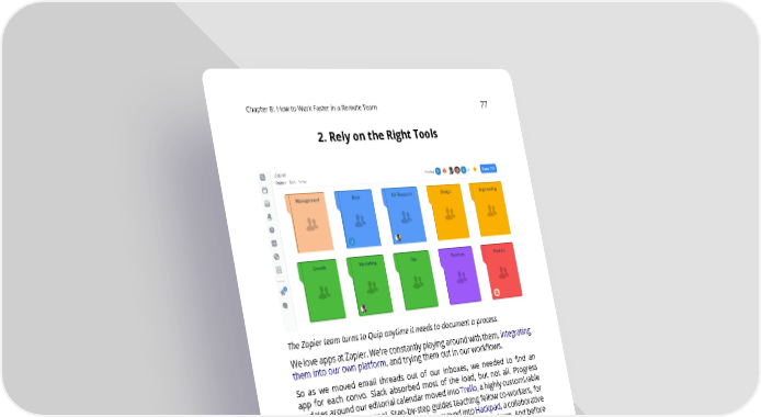 Chapter8: HowtoWorkFasterinaRemoteTeam 77 2. Rely on the Right Tools TheZapier team turns to Quip anytime it needs to document a process. WeloveappsatZapier.We’reconstantlyplayingaroundwiththem,integrating themintoourownplatform,andtryingthemoutinourworkflows. So as we moved email threads out of our inboxes, we needed to find an app for each convo. Slack absorbed most of the load, but not all. Progress updatesaroundoureditorialcalendarmovedintoTrello,ahighlycustomizable project managementtool. Step-by-step guides teaching fellow co-workers, for example,howtoinstigateadripcampaignmovedintoHackpad,acollaborative documentationtool,andthenintoQuipwhenHackpadshutdown.Andbefore werelied on our private internal blog for weekly updates, we used iDoneThis, anappthatmakesiteasytorecordthetasksyouaccomplished. When your remote team lands on the right tools, you can really get in the groove.ThatwasanexperiencesharedbyMatthewMakai,aremoteemployee on Twilio’s team, another company that’s split between co-located and dis- tributed employees. “MycolleagueRickyRobinettandIwrotethisblogpostonournewTaskRouter APItogetherwhilehewasinNYCandIwasinD.C.,”Makaisays,notingseveral other colleagues gave their input on the piece, too.