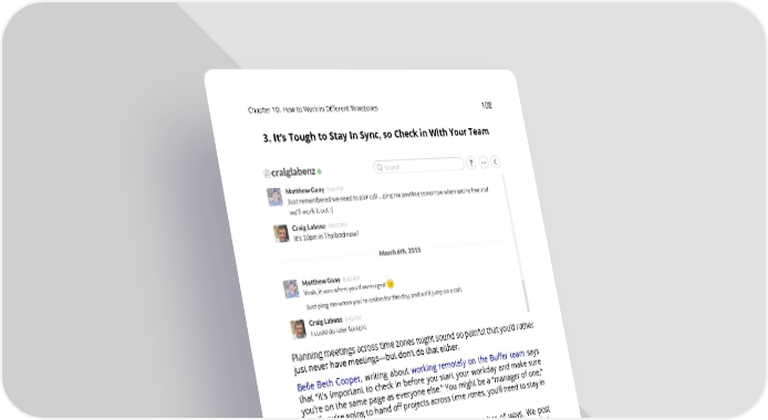Chapter10: HowtoWorkinDifferentTimezones 108 3. It’s Tough to Stay In Sync, so Check in With Your Team Planningmeetingsacrosstimezonesmightsoundsopainfulthatyou’drather just never have meetings—but don’t do that either. Belle Beth Cooper, writing about working remotely on the Buffer team says that “it’s important to check in before you start your workday and make sure you’re on the same page as everyone else.” You might be a “manager of one,” butif you’re going to hand off projects across time zones, you’ll need to stay in touch. At Zapier, we stay connected with our team in a number of ways. We post thoughtsandupdatesaboutteamprojectsonSlack,regardlessofwho’sonline. Plus,eachdepartmenthasaweeklyvideocalltomapoutthatweek’swork,and every Thursday we’ll have an all-hands-on-deck call in order to get everyone together. Every employee is also assigned a random “pair partner” each week— that meanswe’ll jump on a call with one of our colleagues just see how things are going, and perhaps work together on a cross-team project. “Checkinbeforeyoustartyourworkdayandmakesureyou’reonthe samepageaseveryoneelse.”-BelleBethCooper