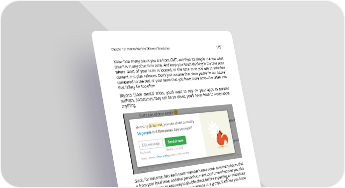 Chapter10: HowtoWorkinDifferentTimezones 115 KnowhowmanyhoursyouarefromGMT,andthenit’ssimpletoknowwhat timeitisinanyothertimezone.Andkeepyourbrainthinkinginthetimezone where most of your team is located, or the time zone you use to schedule content and plan releases. Don’t just assume that since you’re “in the future” compared to the rest of your team that you have more time—I’ve fallen into that fallacy far too often. Beyond those mental tricks, you’ll want to rely on your apps to prevent mishaps. Sometimes, they can be so clever, you’ll never have to worry about anything. Slack, for instance, lists each team member’s time zone, how many hours that is fromyourlocaltime,andthatperson’scurrentlocaltimewheneveryouclick theirname.That’saneasywaytodouble-checkbeforeexpectinganimmediate reply. Or, if you attempt to message everyone in a group, Slack lets you know it’s late for some people before you hit “send.” Tip: If you’re working on distributed team—or just have friends around the world—turn on your phone’s “Do Not Disturb” mode so it won’t ding with notifications all night. Here’s how to do that on iOS andAndroid.
