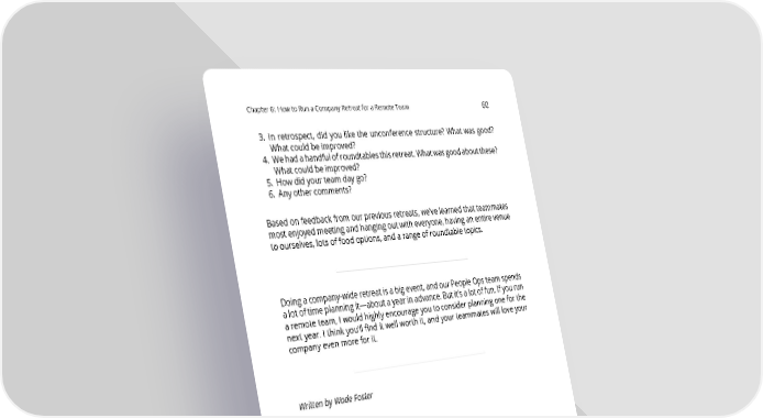 Chapter6: HowtoRunaCompanyRetreatforaRemoteTeam 60 3. In retrospect, did you like the unconference structure? What was good? Whatcouldbeimproved? 4. Wehadahandfulofroundtablesthisretreat.Whatwasgoodaboutthese? Whatcouldbeimproved? 5. Howdidyourteamdaygo? 6. Any other comments? Basedonfeedbackfromourpreviousretreats,we’velearnedthatteammates mostenjoyedmeetingandhangingoutwitheveryone,havinganentirevenue to ourselves, lots of food options, and a range of roundtable topics. Doingacompany-wideretreatisabigevent,andourPeopleOpsteamspends alotoftimeplanningit—aboutayearinadvance.Butit’salotoffun.Ifyourun aremoteteam,Iwouldhighlyencourageyoutoconsiderplanningoneforthe next year. I think you’ll find it well worth it, and your teammates will love your companyevenmoreforit. Written by Wade Foster