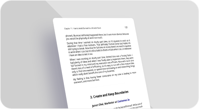 Chapter11: HowtoAvoidBurnoutinaRemoteTeam 129 phone!). Burnout definitely happened there, but it was more obvious because youwouldbephysicallyatworktoomuch. During that time I worked on Acuity part time, so I’d squeeze in work on it whenever I had a free moment. That definitely formed some bad habits I’m still trying to break. Now that I’m full time on Acuity there’s no need to squeeze inworkwhenIcan,butit’sstillahabittochecke-mailswhenIcan,orwhenever I have an idea to test it out. When I was working on Acuity part time, limited time was a forcing factor. I hadplentyofideasandwhenIwasfinallyabletoimplementthem,theywere full formed in my mind and my execution was efficient. Now with more time there’s less of a need of efficiency, so it’s easy to run with a less mature idea, only to find time wasted, or spend time ruminating on and researching things whichreally don’t benefit the core of my business. My feeling is that having fewer constraints on my time is leading to more overwork, and moreburnout. 3. Create and Keep Boundaries JanetChoi,MarketeratCustomer.io Theremoteworker’sgreatestchallengemightbeherself/himself.Whileoneof the best benefits of working remotely is flexibility, that can turn into too much pliancy over where work ends and life begins. WhenIfirst started working remotely, I reverted to a college night-owl sched- ule, whereIwasgettingupandgoingtosleeplaterthantherestofhumanity— andfailing to spend all that time in between in a disciplined way. So I felt like I was never getting enough done AND failing to deal with my well-being and everyday life. That puts you in a continuous dangerous downward-spiral that leads not just to one-time but habitual burnout. “The remote worker’s greatest challenge might be herself/himself.” - Janet Choi, Customer.io