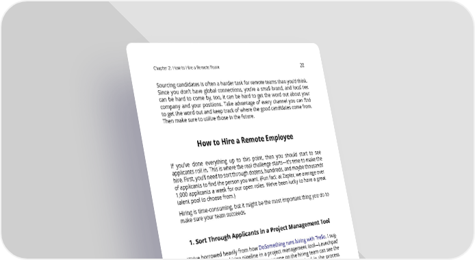 Chapter2: HowtoHireaRemoteTeam 20 Sourcing candidates is often a harder task for remote teams than you’d think. Since you don’t have global connections, you’re a small brand, and local ties can be hard to come by, too, it can be hard to get the word out about your company and your positions. Take advantage of every channel you can find to get the word out and keep track of where the good candidates come from. Thenmakesuretoutilizethoseinthefuture. HowtoHireaRemoteEmployee If you’ve done everything up to this point, then you should start to see applicants roll in. This is where the real challenge starts—it’s time to make the hire.First,you’llneedtosortthroughdozens,hundreds,andmaybethousands of applicants to find the person you want. (Fun fact: at Zapier, we average over 1,000 applicants a week for our open roles. We’ve been lucky to have a great talent pool to choose from.) Hiring is time-consuming, but it might be the most important thing you do to makesureyourteamsucceeds. 1. Sort Through Applicants in a Project Management Tool We’ve borrowed heavily from how DoSomething runs hiring with Trello. I sug- gest managing the hiring pipeline in a project management tool—Launchpad LA, for example, uses Asana—so that everyone on the hiring team can see the candidates, comment on their application and feel involved in the process. As a remote team, you don’t get those in-person, team conversations about candidates,sofindingonespottohavethosechatsputseveryoneonthesame page. We use Greenhouse to manage the hiring process, but previously we used Trello boards for each open role with a Zapier integration that automatically creates a Trello card for candidates in the “Applied” column. Next, we nominate someonetorunpointforhiringforthatposition.Theyare in charge of all the initial screening and, together with our Recruiting team, making sure the ball never gets dropped in the hiring process. This role is