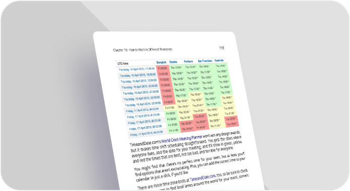 Chapter10: HowtoWorkinDifferentTimezones 119 TimeandDate.com’sWorldClockMeetingPlannerwon’twinanydesignawards, but it makes time shift scheduling straightforward. You pick the cities where everyone lives, and the date for your meeting, and it’ll show in green, yellow, andredthetimesthatarebest,nottoobad,andterribleforeveryone. You might find that there’s no perfect time for your team, but at least you’ll find options that aren’t excruciating. Plus, you can add the correct time to your calendar in just a click, if you’d like. TherearemoretimezonetoolsatTimeandDate.com,too,sobesuretocheck it out if you want to find local times around the world for your event, convert times for any location, and more. Tip: Need a tool that’s more accessible and works well with screen readers?TryoutInternationalMeetingPlannerforasimilartoolwith aslightly simpler interface. WorldMeetingTime