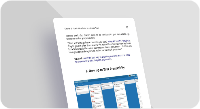 Chapter8: HowtoWorkFasterinaRemoteTeam 85 Remote work also doesn’t need to be restricted to your own abode—go wherevermakesyouproductive. “Often just being at home can drive you nuts,” writes Microsoft’s Hanselman. “I try to get out a few times a week. I’ve worked from the mall, from Starbucks, from McDonald’s (free wi-fi, sue me) and from a park bench. I find that just having people walking around makes me feel more productive.” Related: Learn the best way to organize your desk and home office for maximumproductivityandergonomics. 8. OwnUptoYourProductivity Whetherit’sworkinginyourownhomeoranearbycoffeeshop,there’sanother aspect that pushes remote employees to work faster: You’re responsible for your productivity. Gone are the regular meetings and brainstorming sessions in“ConferenceRoom3B,”andnomorecanyoupullupaspreadsheetandstare atyourscreentoappearengulfedinbusywork.Younowmustownuptowhat youdidanddidn’taccomplish.