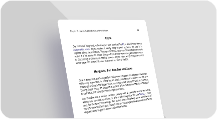 Chapter3: HowtoBuildCultureinaRemoteTeam 30 Async Our internal blog tool, called Async, was inspired by P2, a WordPress theme Automattic uses. Async makes it really easy to post updates. We use it to replaceallourteamemails.Theasynchronousnatureandthreadedcomments make it a lot easier to share things—from posts welcoming new teammates to discussing architectural scaling issues—Async helps keep everyone on the samepage.It’salmostlikeourownminiversionofReddit. Hangouts,PairBuddiesandZoom Chatisawesome,butbeingabletotalkinrealtimeandvisuallyseesomeoneis still pretty important for some issues. Slack calls for quick, ad-hoc one-on-one meetingsorZoomforbiggerteammeetingsmakeiteasytoworkinrealtime. Duringthesechats,it’s always fun to have a five-minute personal checkup just to see what the other person/people are up to. Pair Buddies are a weekly random pairing with 2-3 people on the team that allows you to catch up on work, life, or anything else. We use Donut, a Slack app, for the random pairings. Pair buddy chats help keep some semblance of theofficesociallifeaspartofworkandencouragepeoplewhoworkindifferent departmentstogettoknoweachotherbetter.