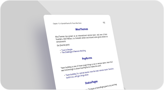 Chapter15: ASpecialThanksToThoseWhoShare 182 WooThemes WooThemes has grown as an international remote team. And one of their founders, Adii Pienaar, is a fantastic writer and shared some great articles on remotework. Ourfavorite posts: • Trust In People • The Challenge of Remote Working Popforms Teambuilding is one of those tough things to do in remote teams. Kate Stull waskindenoughtosharehowPopformsmakesthiswork. • Team-building for remote teams: how the best remote teams function, build trust, and get things done StatusPages Remoteworkisn’tforeveryone.TheteamatStatusPagesgaveitatryandthey hatedit. Here’s why. • WeTriedBuildingaRemoteTeamanditSucked iDoneThis The iDoneThis blog is one of the best blogs out there on management. This post digs into remote team communicate and how to make it work. • RemoteTeamCommunication