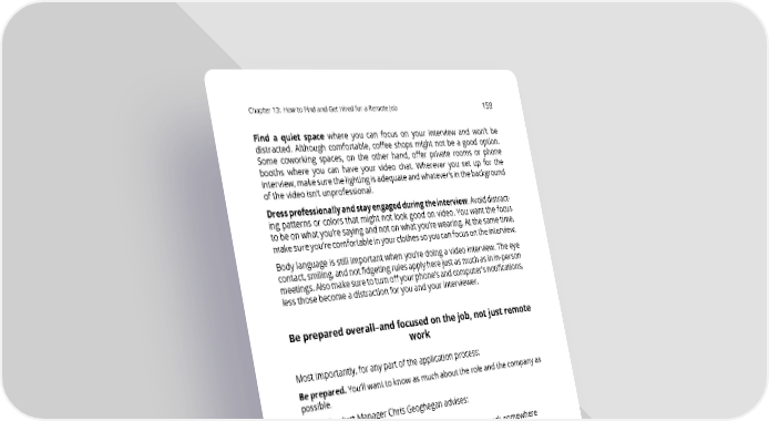 Chapter13: HowtoFindandGetHiredforaRemoteJob 159 Find a quiet space where you can focus on your interview and won’t be distracted. Although comfortable, coffee shops might not be a good option. Some coworking spaces, on the other hand, offer private rooms or phone booths where you can have your video chat. Wherever you set up for the interview,makesurethelightingisadequateandwhatever’sinthebackground of the video isn’t unprofessional. Dressprofessionallyandstayengagedduringtheinterview.Avoiddistract- ing patterns or colors that might not look good on video. You want the focus tobeonwhatyou’resayingandnotonwhatyou’rewearing.Atthesametime, makesureyou’recomfortableinyourclothessoyoucanfocusontheinterview. Bodylanguage is still important when you’re doing a video interview. The eye contact,smiling,andnotfidgetingrulesapplyherejustasmuchasinin-person meetings.Alsomakesuretoturnoffyourphone’sandcomputer’snotifications, less those become a distraction for you and your interviewer. Bepreparedoverall–andfocusedonthejob,notjustremote work Mostimportantly, for any part of the application process: Beprepared.You’llwanttoknowasmuchabouttheroleandthecompanyas possible. Zapier Product Manager Chris Geoghegan advises: Being able to clearly articulate why you want to work somewhere (besides the fact that the position is remote) is really important. In job fit interviews, you definitely see this where some candidates are clearly more interested in the remote aspect of Zapier, and I think that can be red flag. Jason Kotenko, Zapier Platform Lead, adds: Explain why you want the exact position. Just wanting to work at a remotecompanyisusuallynotenoughforspecializedroles.