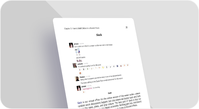 Chapter3: HowtoBuildCultureinaRemoteTeam 28 Slack Slack Slack is our virtual office. It’s the online version of the water cooler—where random work discussions happen, but also where we banter back and forth about the news, jokes, and pop culture. The best part of Slack is that our water cooler discussions are always accessible. Nothing gets lost. And there’s no“behind-your-backpolitics” that happens in many co-located offices. WemakeheavyuseofemojiinSlackaswell.