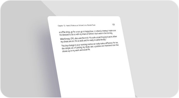 Chapter12: HowtoThriveasanExtrovertonaRemoteTeam 139 acoffee shop, go for a run, go to happy hour, or attend a meetup I make sure I’m dressed to do so with my shoes on before I start work in the morning. MikeKnoop,CPO,alsousesthistrick:“It’ssuchasmallthingbutitworks.When myshoesareon,I’matworkandI’mreadytotackletheday.” This tiny change in your morning routine can really make a difference. For me, the simple act of putting my shoes sets a positive and intentional tone that showsupinmyworkandsociallife.