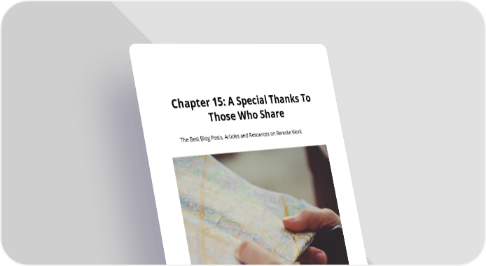 Chapter15:ASpecialThanksTo ThoseWhoShare TheBestBlogPosts,ArticlesandResourcesonRemoteWork We wouldn’t have been as successful as we have been at remote working without other people and companies sharing what they’ve learned along the way. Here are the posts, books, and other resources about remote working that have inspired and challenged me to think differently. We’dliketosayThankyou!toallthesepeopleandcompaniesforsharingtheir experiencesandprovidingamaptohelpusnavigatethechallengesofremote working. I hope you’ll find these resources helpful as well.