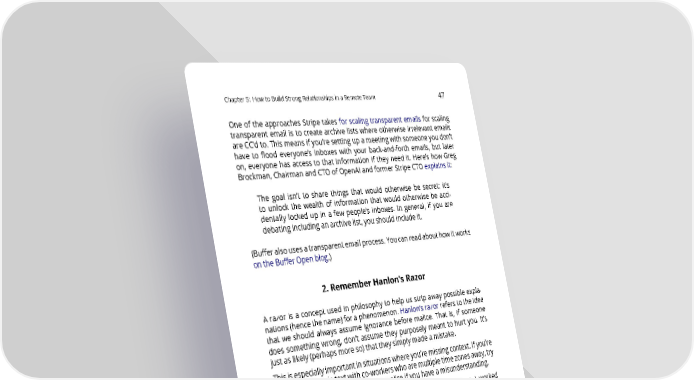 Chapter5: HowtoBuildStrongRelationshipsinaRemoteTeam 47 Oneoftheapproaches Stripe takes for scaling transparent emails for scaling transparent email is to create archive lists where otherwise irrelevant emails are CC’d to. This means if you’re setting up a meeting with someone you don’t have to flood everyone’s inboxes with your back-and-forth emails, but later on, everyone has access to that information if they need it. Here’s how Greg Brockman,ChairmanandCTOofOpenAIandformerStripeCTOexplainsit: The goal isn’t to share things that would otherwise be secret: it’s to unlock the wealth of information that would otherwise be acci- dentally locked up in a few people’s inboxes. In general, if you are debating including an archive list, you should include it. (Bufferalsousesatransparentemailprocess.Youcanreadabouthowitworks ontheBufferOpenblog.) 2. RememberHanlon’sRazor A razor is a concept used in philosophy to help us strip away possible expla- nations(hencethename)foraphenomenon.Hanlon’srazorreferstotheidea that we should always assume ignorance before malice. That is, if someone does something wrong, don’t assume they purposely meant to hurt you. It’s just as likely (perhaps more so) that they simply made a mistake. Thisisespeciallyimportantinsituationswhereyou’remissingcontext.Ifyou’re communicatingviatextwithco-workerswhoaremultipletimezonesaway,try to always assume ignorance before malice if you have a misunderstanding. In my own experience, this has happened several times. When I worked remotelyforBuffer,IwouldoftenjumponacallwithLeotodiscusssomething we’d disagreed about, only to realize we weren’t on the same page at all, and it had all been a misunderstanding. AssertingYourselfWhenNeeded Perhaps the hardest, yet most obvious, way to compensate for the lack of context in remote communication is to be more forward and open than you