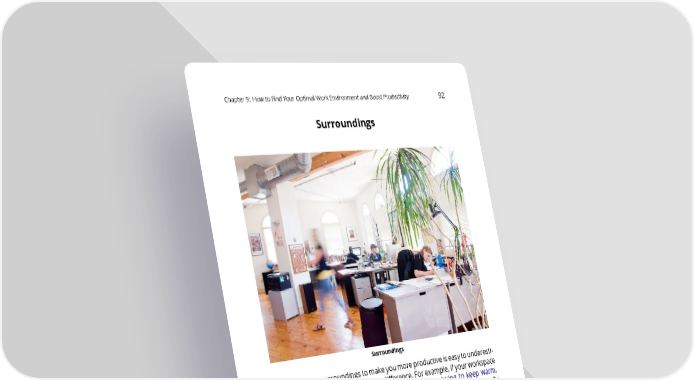 Chapter9: HowtoFindYourOptimalWorkEnvironmentandBoostProductivity 92 Surroundings Surroundings Adjustingyoursurroundingstomakeyoumoreproductiveiseasytounderesti- mate,butcanactuallymakeahugedifference.Forexample,ifyourworkspace is too cold, you’re actually going to be wasting energy trying to keep warm. Of course being too warm is no good for your productivity either. You really needtofindyour“sweetspot”asfarastemperaturegoes,andtrytogetyour workplaceasclosetothataspossible.TheteamatZapierhasthisfiguredout; everyone knows just what temperature they work best at, and takes control of keeping their workspace from getting too hot or cold. If you’re sharing a workspace you might need to bring in a portable fan or heater, or move your desk to be closer to the heating and cooling system (or further away). Noise levels (and types) are another environmental factor that can affect