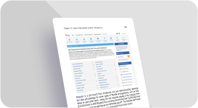 Chapter13: HowtoFindandGetHiredforaRemoteJob 154 FlexJobs is a job board that showcases not just telecommuting openings, but also job postings for other types of flexible arrangements, such as free- lance or part-time work. Using the site requires paying a fee (ranging from $14.95/monthto$49.95/year),butcurrentlythesitelistsover32,000jobsfrom 4,725 companies–so signing up can definitely pay off. The FlexJobs staff hand- screen each job posting so you can avoid work-from-home scams. Jobspresso