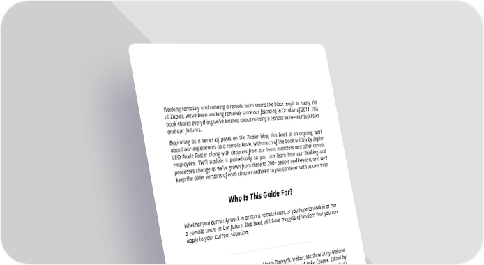 Working remotely and running a remote team seems like black magic to many. Yet at Zapier, we’ve been working remotely since our founding in October of 2011. This bookshareseverythingwe’velearnedaboutrunningaremoteteam—oursuccesses andourfailures. Beginning as a series of posts on the Zapier blog, this book is an ongoing work about our experiences as a remote team, with much of the book written by Zapier CEO Wade Foster along with chapters from our team members and other remote employees. We’ll update it periodically so you can learn how our thinking and processes change as we’ve grown from three to 200+ people and beyond, and we’ll keeptheolderversionsofeachchapterarchivedsoyoucanlearnwithusovertime. WhoIsThisGuideFor? Whetheryoucurrentlyworkinorrunaremoteteam,oryouhopetoworkinorrun a remote team in the future, this book will have nuggets of wisdom that you can apply to your current situation. WrittenbyWadeFoster,withcontentfromDannySchreiber,MatthewGuay,Melanie Pinola, Bethany Hills, Alison Groves, Jeremey DuVall, and Belle Cooper. Edited by Danny Schreiber, Matthew Guay, and Melanie Pinola. Last updated on March 30, 2019.