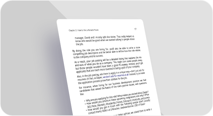 Chapter2: HowtoHireaRemoteTeam 17 manager, David and I mostly split the duties. That really helped us knowwhowouldbegoodwhenwestartedtalking to people about the job. By doing the role you are hiring for, you’ll also be able to write a more compelling job description and be better able to define how the role relates to the companyanditssuccess. As a result, your job posting will be a detailed listing that explains the ins- and-outs of what you do as a company. This might turn some people away, but those people wouldn’t have been a good fit anyway. Instead, you’ll get applicants that are much more invested in being a part of your company. Also, in the job posting, ask them to apply in a unique way—don’t just ask for resumes.(Infact,atZapier,wedon’taskforresumesatall.Instead,trytomake the application process prove their abilities for the job. For instance, when hiring for our business development position we had candidates that tested the basics of the role’s partner duties, with questions like: • Whyareyouapplyingforthisrole?WhatmakesyouexcitedaboutZapier? • How would you prioritize these upcoming integrations and why? Office 365,Flickr,Marketo,Wunderlist,Pocket,Ontraport,Hootsuite,andJoomla • How would you get in touch with the following people (don’t actually contact them): Editor at Lifehacker, Andrew Warner, CEO of Slack? And rather than asking for a cover letter upfront, we asked them to write a samplepitchemailtoapartner. People excited about your company are willing to complete these extra tasks, often with enjoyment. Those whoaren’t a good fit just skip your post or forget to do it, turning the unique application process into a filter. Forallourjobpostings,wealsowanttoconveyourcompanyculture.Sowealso postourcommitmenttoapplicants,whichincludesourpromisetorespondto every candidate, our culture and values, how we have been working on hiring for diversity and inclusivity, and the Zapier code of conduct, which boils down to everyone treating each other professionally and with respect. Putting these out in the open has helped candidates feel more comfortable taking that leap of faith when applying for a job.