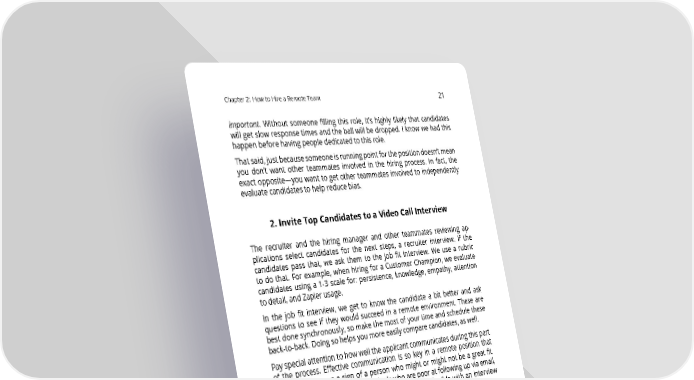 Chapter2: HowtoHireaRemoteTeam 21 important. Without someone filling this role, it’s highly likely that candidates will get slow response times and the ball will be dropped. I know we had this happenbeforehavingpeoplededicatedtothisrole. Thatsaid,justbecausesomeoneisrunningpointforthepositiondoesn’tmean you don’t want other teammates involved in the hiring process. In fact, the exact opposite—you want to get other teammates involved to independently evaluate candidates to help reduce bias. 2. Invite Top Candidates to a Video Call Interview The recruiter and the hiring manager and other teammates reviewing ap- plications select candidates for the next steps, a recruiter interview. If the candidates pass that, we ask them to the job fit interview. We use a rubric to do that. For example, when hiring for a Customer Champion, we evaluate candidates using a 1-3 scale for: persistence, knowledge, empathy, attention to detail, and Zapier usage. In the job fit interview, we get to know the candidate a bit better and ask questions to see if they would succeed in a remote environment. These are best done synchronously, so make the most of your time and schedule these back-to-back. Doing so helps you more easily compare candidates, as well. Payspecial attention to how well the applicant communicates during this part of the process. Effective communication is so key in a remote position that the little things are a sign of a person who might or might not be a great fit. Potential warning signs are individuals who are poor at following up via email, forget when the interview was scheduled, or aren’t flexible with an interview time. Matthew Guay, for example, is a U.S. expat based in Bangkok, which means his work hours are completely opposite of ours in the States. But during the interview process, he was more than happy to stay up late in order to meet our whole team on a conference call. His quickness to schedule and flexibility played a role in his hiring.