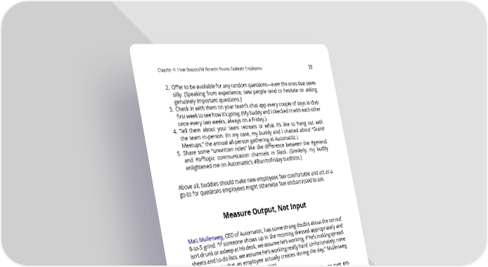 Chapter4: HowSuccessfulRemoteTeamsEvaluateEmployees 39 2. Offertobeavailableforanyrandomquestions—eventheonesthatseem silly. (Speaking from experience, new people tend to hesitate on asking genuinely important questions.) 3. Check in with them on your team’s chat app every couple of days in their first weektoseehowit’sgoing.(MybuddyandIcheckedinwitheachother onceeverytwoweeks,alwaysonaFriday.) 4. Tell them about your team retreats or what it’s like to hang out with the team in-person. (In my case, my buddy and I chatted about “Grand Meetups,”theannualall-persongatheringatAutomattic.) 5. Share some “unwritten rules” like the difference between the #general and #offtopic communication channels in Slack. (Similarly, my buddy enlightened meonAutomattic’s#BurritoFridaytradition.) Aboveall, buddies should make new employees feel comfortable and act as a go-to for questions employees might otherwise feel embarrassed to ask. MeasureOutput,NotInput MattMullenweg,CEOofAutomattic,hassomestrongdoubtsaboutthenormal 9-to-5 grind. “If someone shows up in the morning dressed appropriately and isn’tdrunkorasleepathisdesk,weassumehe’sworking.Ifhe’smakingspread- sheetsandto-dolists,weassumehe’sworkingreallyhard.Unfortunately,none of this gets at what an employee actually creates during the day,” Mullenweg says in a Harvard Business Review post. One potential solution to this conundrum? Have managers hover over em- ployees either by roaming up and down the aisles in a traditional sense or obsessively checking to see when someone logs in or out. According to Ciotti, that’s the shortcut to burnout: Fires only burn when they have room to breathe, and you’ll end upsuffocatingenthusiasm,motivation,andcamaraderiebylooming overpeopleallday,everyday. Instead, productivity at Automattic is measured by output, not input.